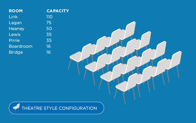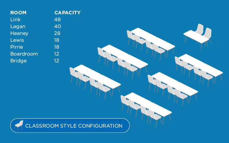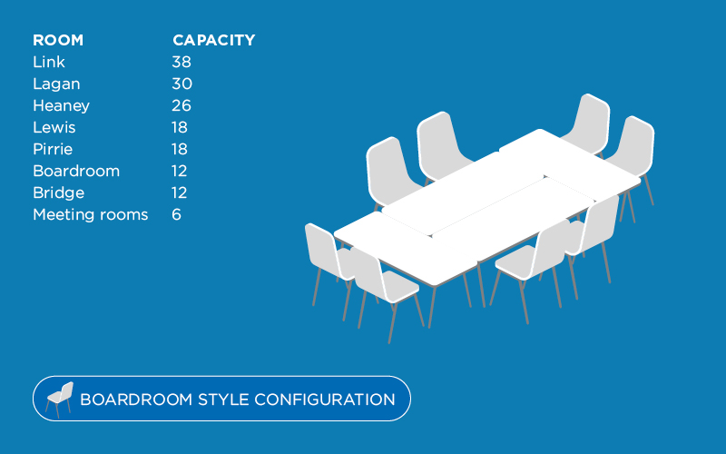 The Lagan room is a large conference room on the ground floor with excellent natural day light and high ceilings creating a bright and airy room for training and meetings.